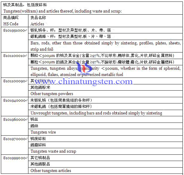 O código HS do tungstênio é o código do sistema de harmonização, usado para diferentes substâncias, como tungstênio, tungstênio, pó de tungstênio, sucata de tungstênio, fio de tungstênio e outros internacionalmente.